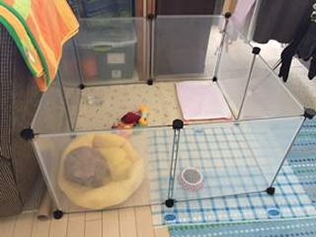 里子の募集をしてからなかなか決まらず、「どうしてこんないい子が決まらないんだろうね」と不思議に思っておりましたが、待ったかいがありました。居住スペースも素敵に作っていただきました。広くてお留守番の時にウンチを踏んづけることもなさそうです。プライバシーが保てるように? 半透明のフェンスにしていただいているんですね。みなさんも参考になるのではないでしょうか。