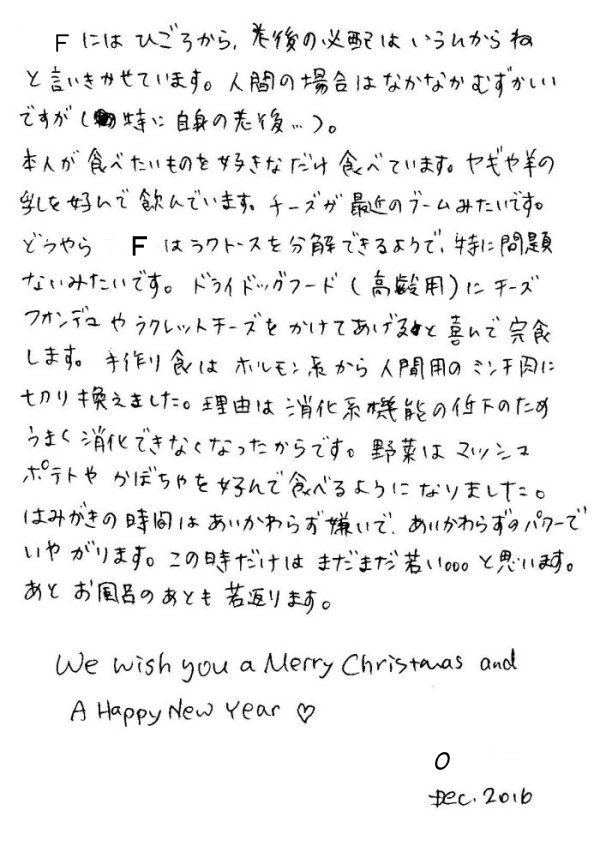 お誕生月近くになると近況をお知らせいただくFちゃん、年齢が年齢だけに今年はどうなんだろう、とちょっぴりドキドキしてお待ち申し上げておりました。