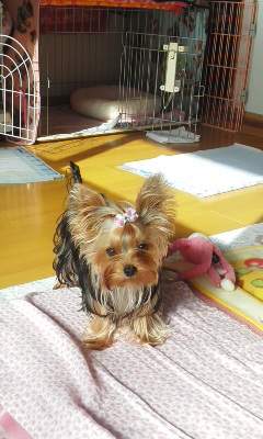 宮城県 斎藤様 振り返りますと、先住犬が亡くなってずーっとヨーキーの女の子を捜していました。ペットショップやアマンダさんのHPを拝見させて頂いてたのですがタイミングがあわず、もうあきらめかけてた矢先、すみれちゃんを見つけ即「見学させて下さい」とお電話したものでした。 昨年の8月には、ななちゃんも迎える事が出来、毎日2匹で大運動会が始まります、すみれちゃんはおっとり性格ですが、ななちゃんはおてんばさん。喧嘩なのか、じゃれあってるのかわからない時もありますやっぱりテリア気質ですね。 すみれ&ななちゃんに出会わせて下さった宮澤様に感謝し大事に育てて行きたいです。 <アマンダより返信> すみれちゃんとななちゃんではお顔も性格も違いますが、そこが多頭飼いの醍醐味、楽しみの一つではないでしょうか。もともと人間でも同じ顔や性格の人はおりませんものね。 最近お仕事を始められ、夕方までお留守番を余儀なくされた両ワンちゃんですが、帰宅したらどうぞその分濃密な愛情を振り注いでくださいね。ママだけが頼りなんですから。 この度は近況ご報告有難うございました。またのお便りを心よりお待ちしております。