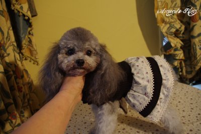 先日来 子犬の見学のご予約をしてくださっていたH様(氏)が東京よりシルバーの超ティーカップの女の子に会いにお出でくださった。お聞きするところによると、長年プードルを5頭飼っていたが、18歳余でシルバーのプードルちゃんが1頭老衰で亡くなったため、今回新たにシルバーの女の子を検討されていたとのこと。当方のことは3年前から同じ東京のわんこ服の 店ブル・ブブさんから聞いておられたようだ。ブル・ブブ さんと言えば過去に当方出身のプッチーニちゃんがモデル犬を務めていたショップさんだ。プッチちゃんの載っているカタログを私は今でも大切にしまっている。現在はやはりブル・ブブさんのオーナーさんにお譲りさせていただいたアプリコットのティーカップちゃんがモデル犬をしているとのこと。広いようで狭いところでつながっているものだと、一層の親近感を覚えた。